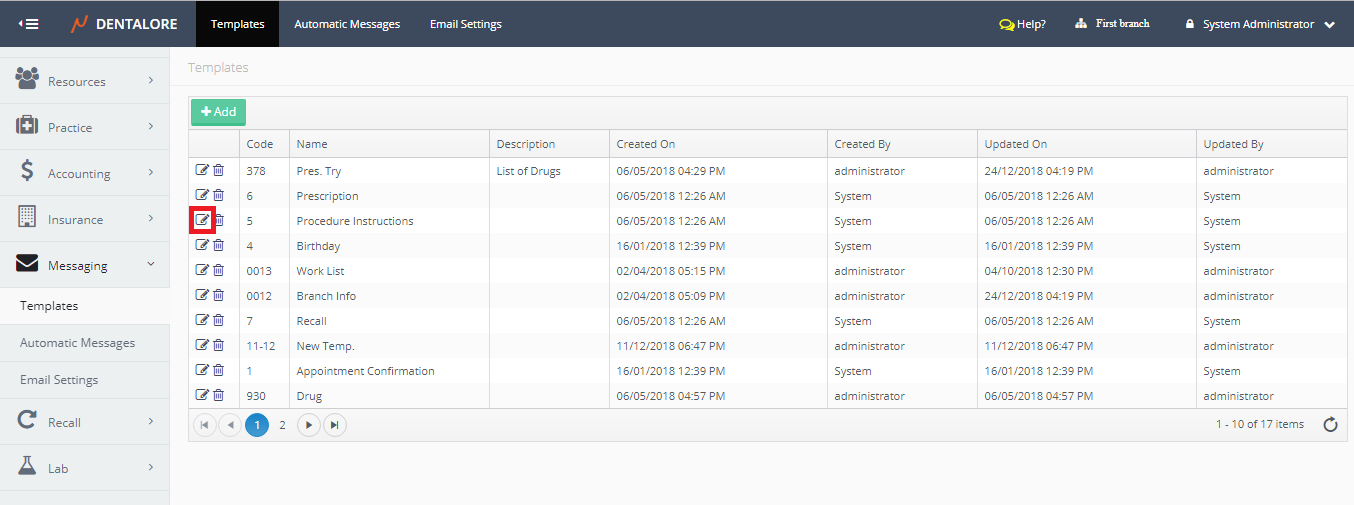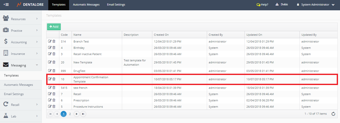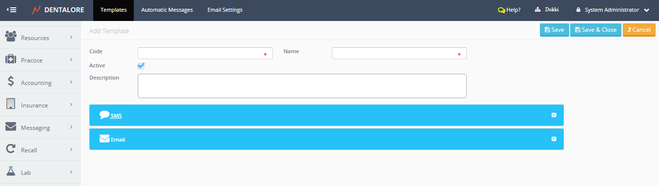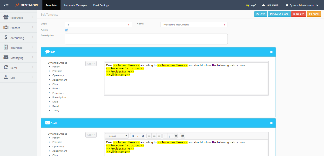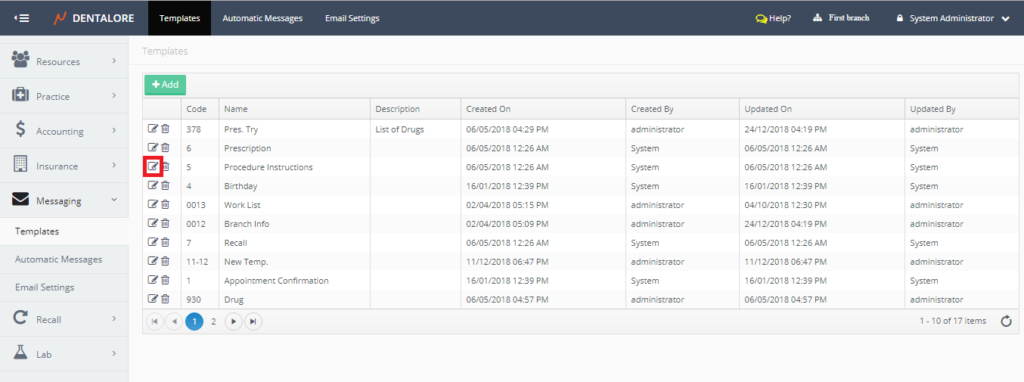 Messaging Templates is the place where user could define new templates to be used while sending manual and automatic messages as well finding the predefined templates by DentaLore System.
