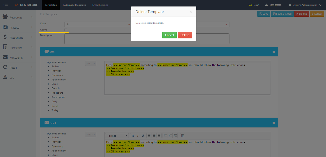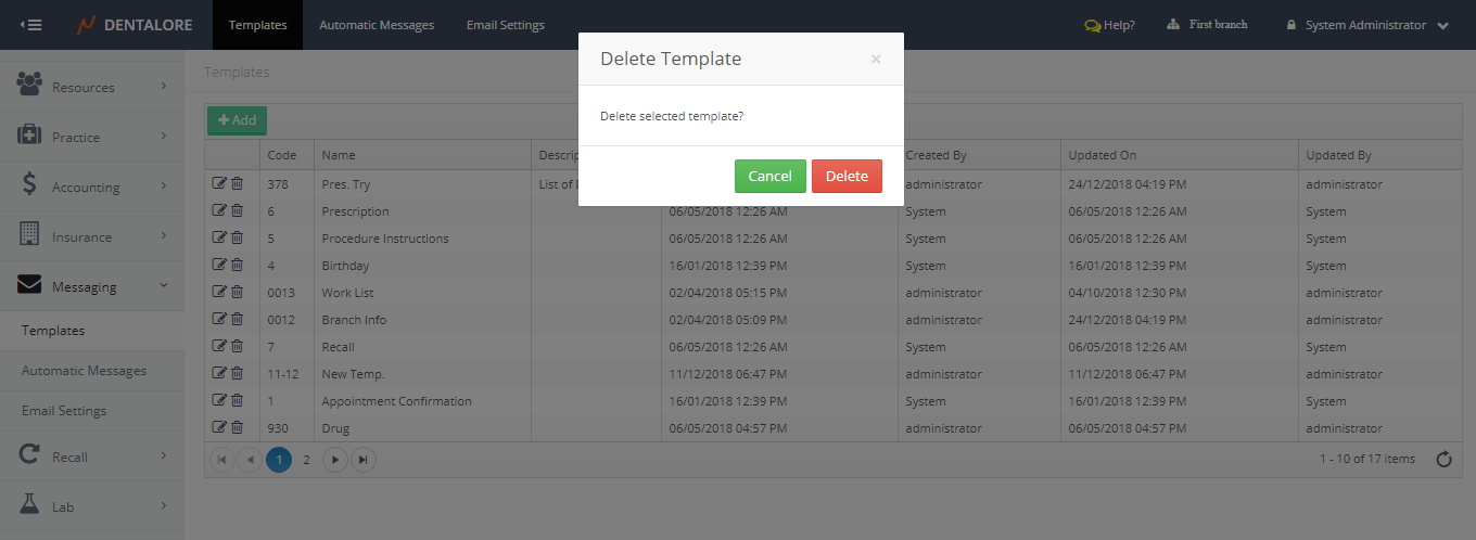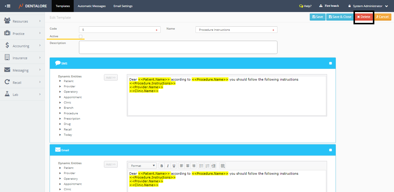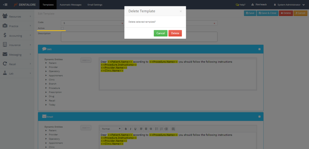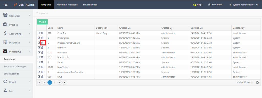Messaging Templates is the place where user could define new templates to be used while sending manual and automatic messages as well finding the predefined templates by DentaLore System.
