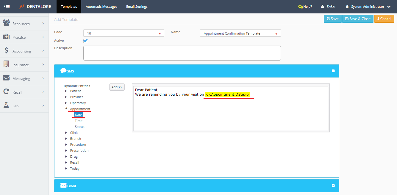 -- Email Section: Is a section that contains all dynamic entities available in Dentalore system to be used for automatic messages, and a rich text box to type the required message (Email) that will be sent.