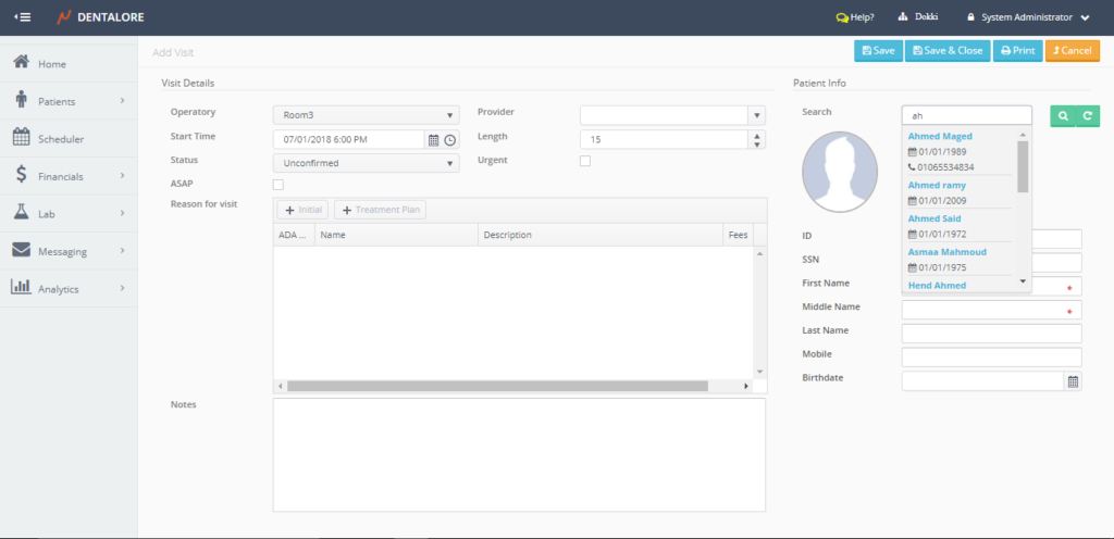 Create appointment for existing patient Created: 09/01/2018 / Author: nebras-dentalore Go to Scheduler Select the appropriate date Double click the empty slot in the selected room and time The Add Visit window appears, search for patient, select the provider and fill other information Press Save and Close