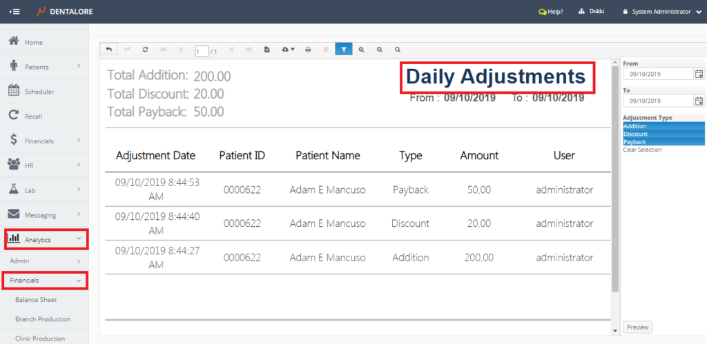 - Grid: Contains Adjustment Date, Patient ID, Patients Name, Type, Amount and User.
