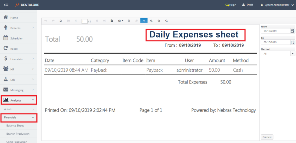 - Displays the date and time when the expenses transaction has been performed within the selected date range.