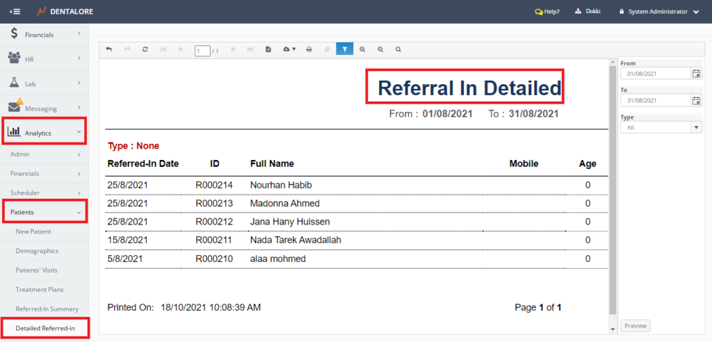 Referred In report displays patients’ data grouped by each referral type in grid view whose columns are: