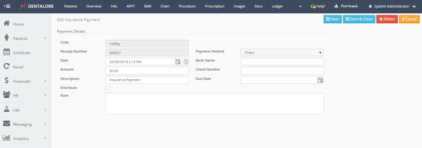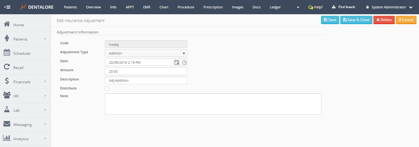 - As well User could "Delete" the selected transaction by pressing the "Delete" button in the "Edit Insurance Payment" and "Edit Insurance Adjustment" pages.