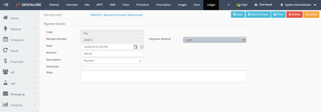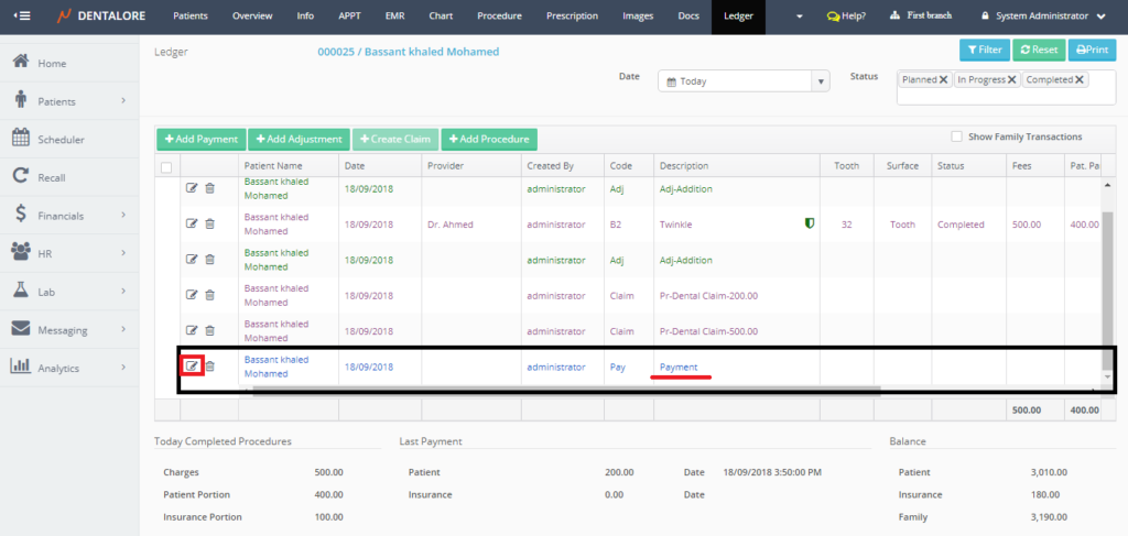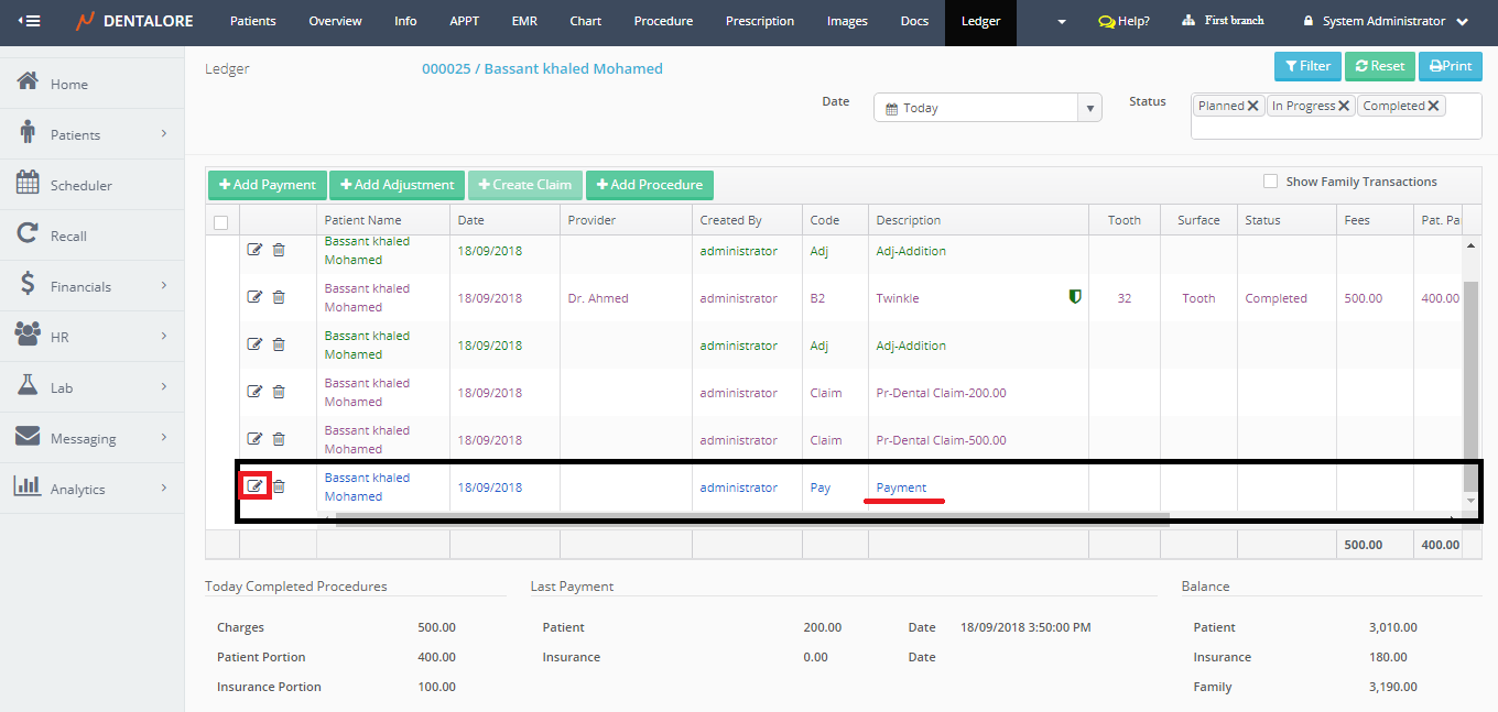 - Select any of the existing patients and then Select "Ledger".