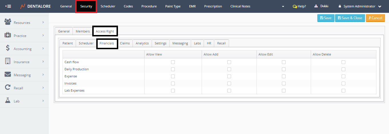 • Allow Add: Allows user to perform Payment and Adjustment transactions related to the selected lab in the ‘Lab Expenses’ view.