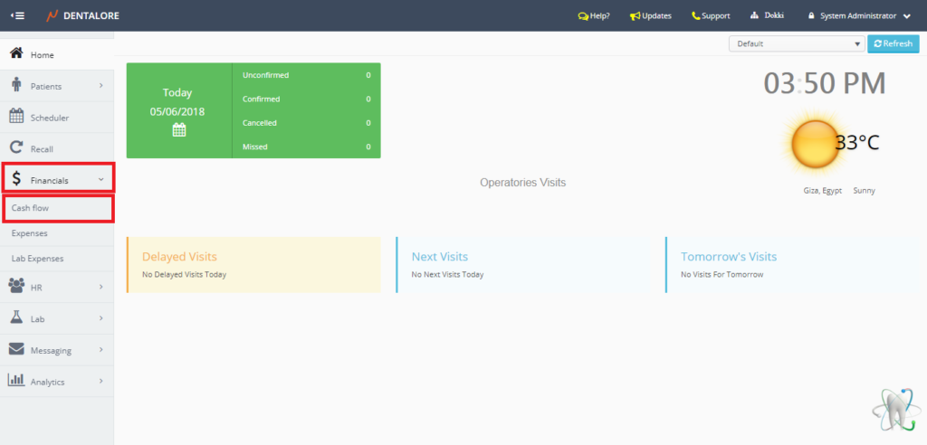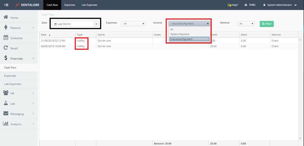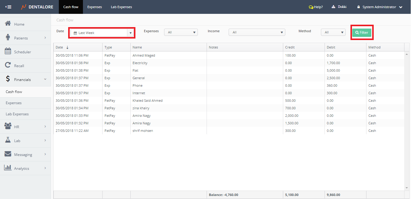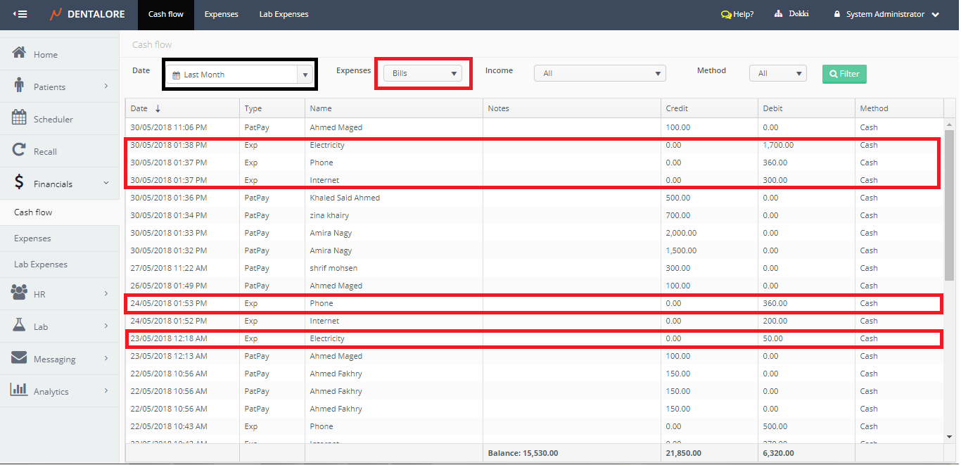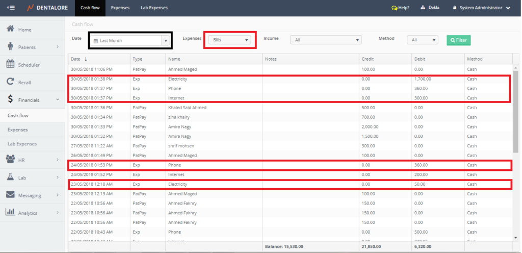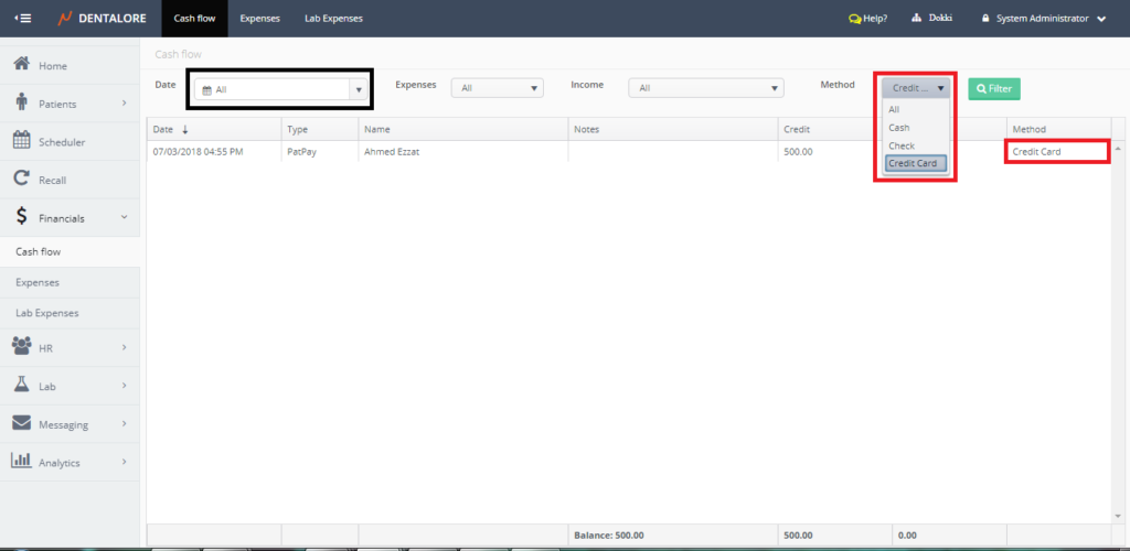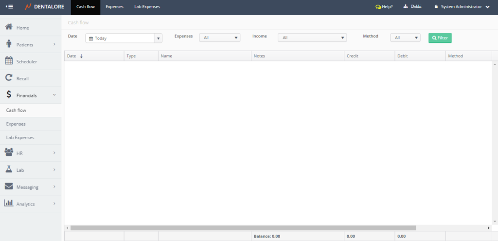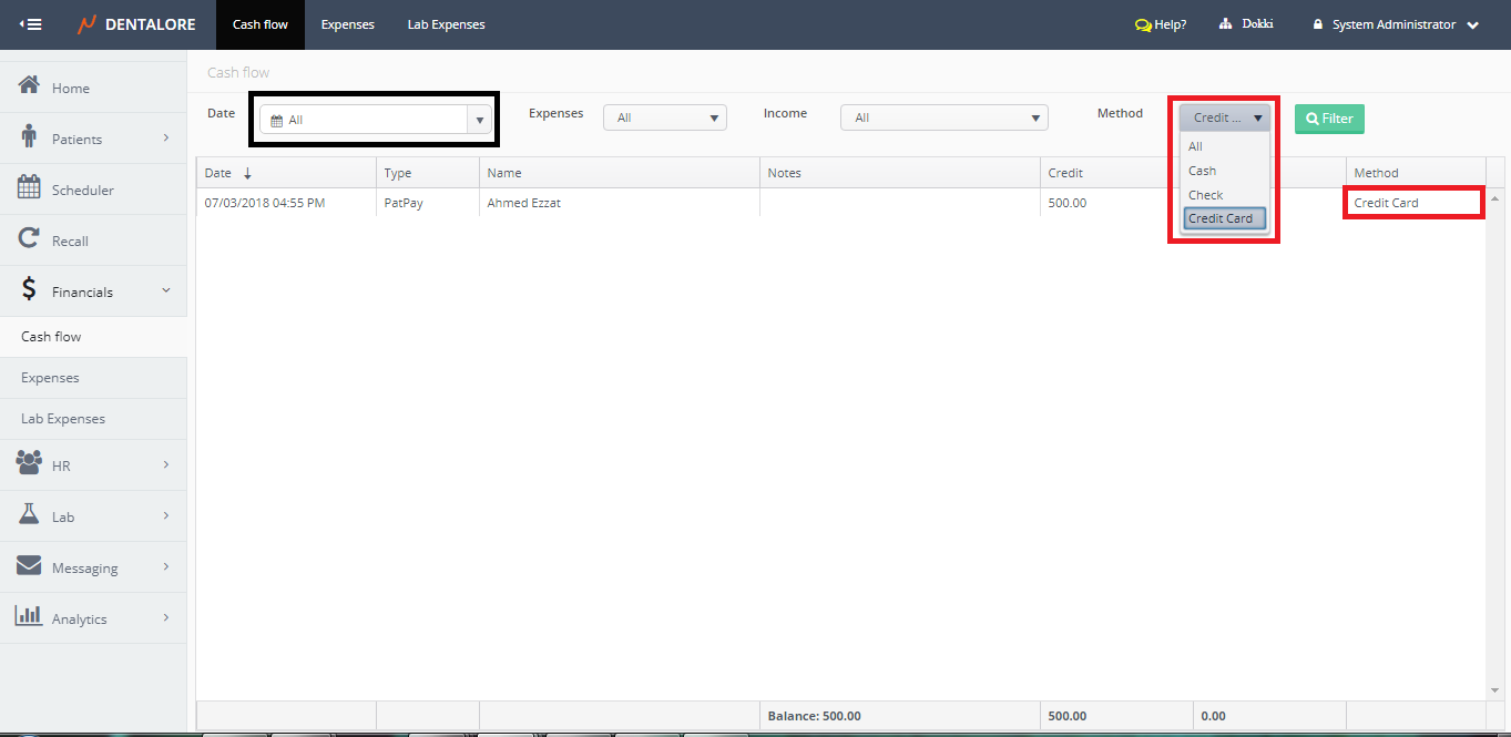 The cash flow sub module displays all payments (Patient & Insurance) and Expenses performed in the selected branch of clinic each with it’s payment method. Moreover the user has the ability to search only for specific required items from the expenses or the income, even to search using the method of payment.