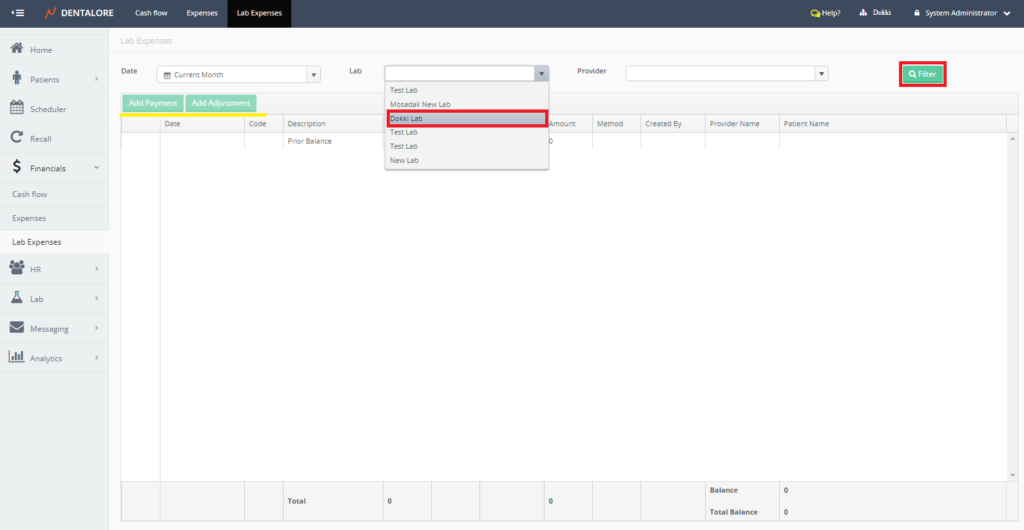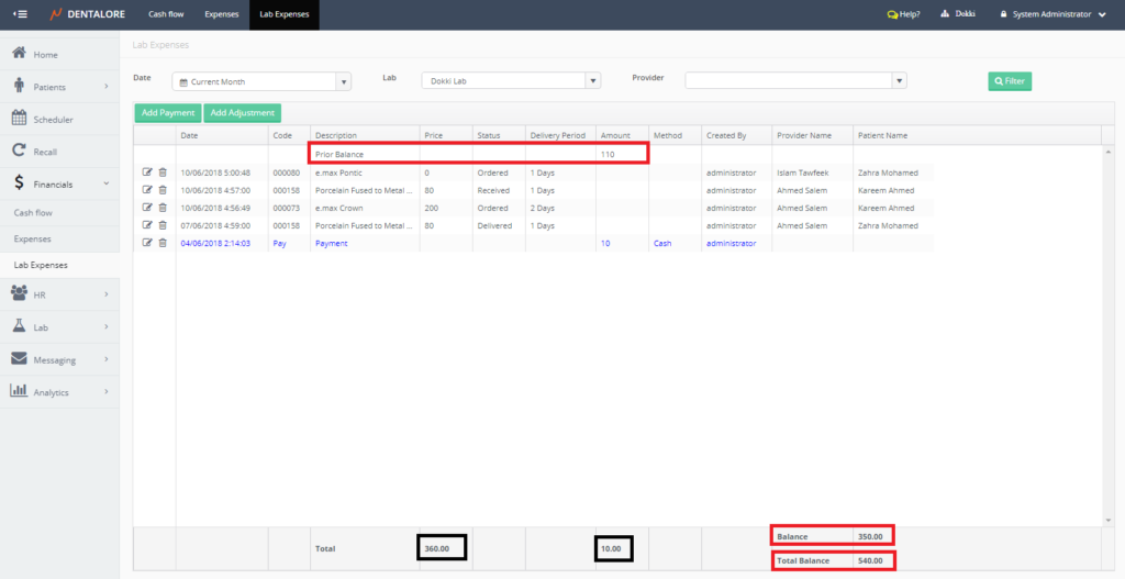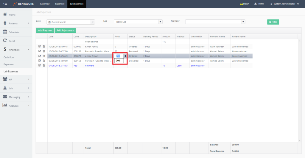 The Lab Expenses sub module displays all expenses related to lab cases once the lab case is being ordered in the selected branch of clinic. Also it displays the payments and adjustments performed for a selected lab once user starts dealing with it.