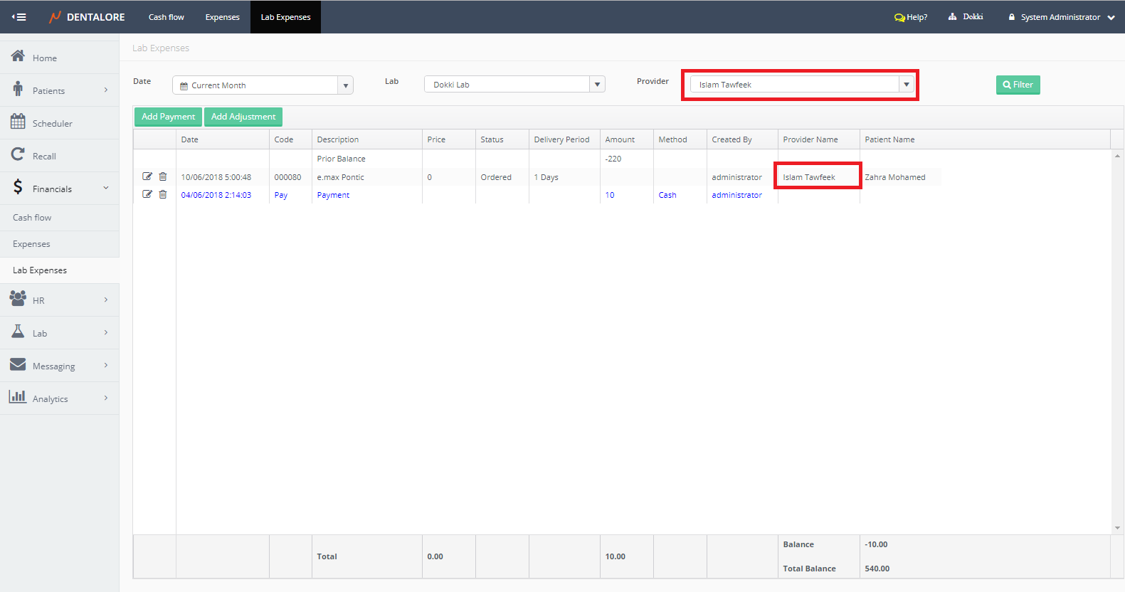 • The user has the ability to filter the lab expenses grid view by a specific provider, in order to know the lab cases related to the selected provider only.