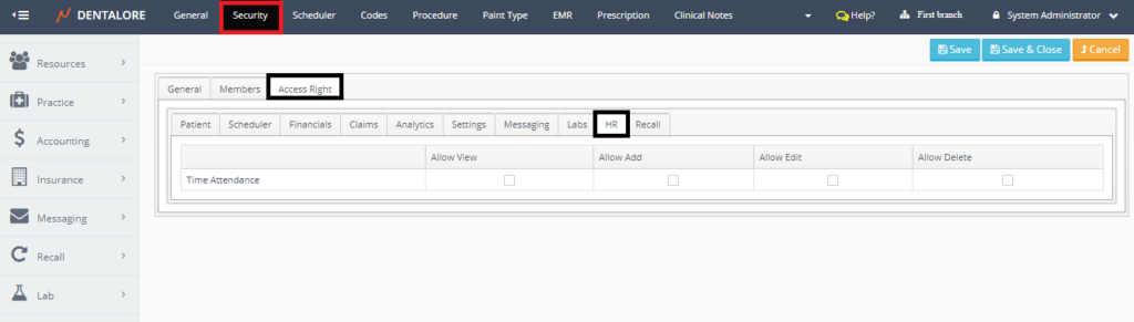 - Allow View: Displays the Time Attendance Sheet for all users (Providers and Employees) in your clinic in HR Module.