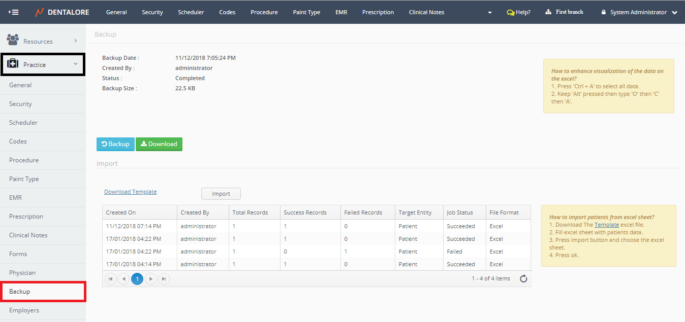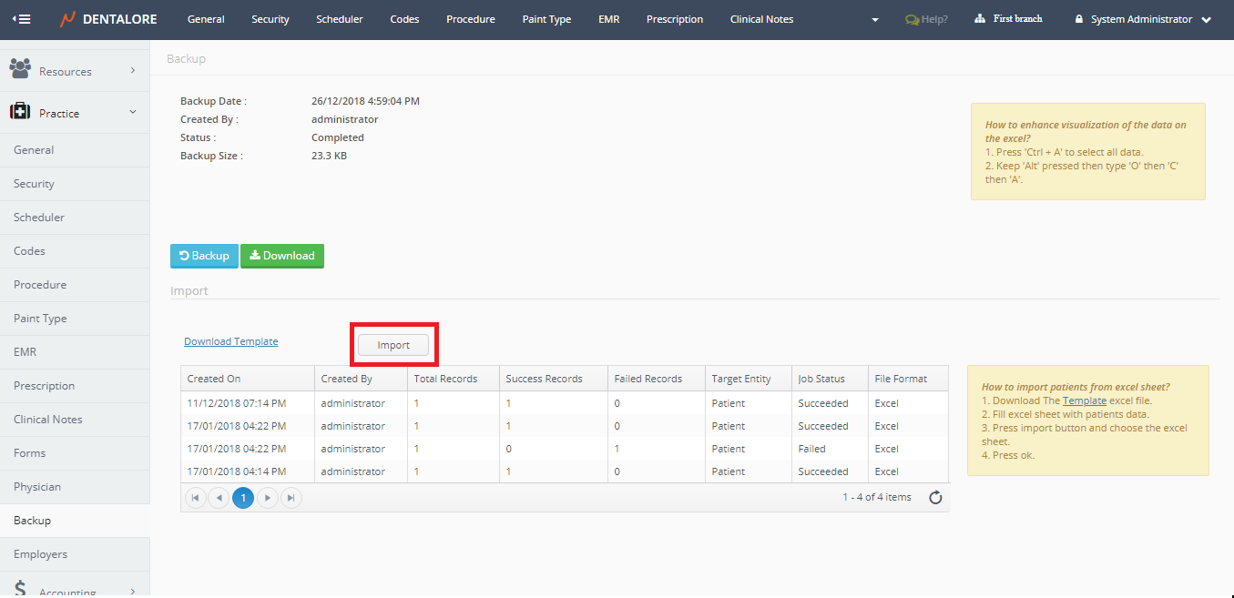 DentaLore System offers one of the most important features in any cloud software system which is importing patient's data to the system and as well ability to take a backup of your data.