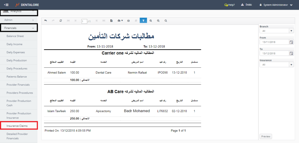 Insurance Claims report displays the following data for each insurance company:
