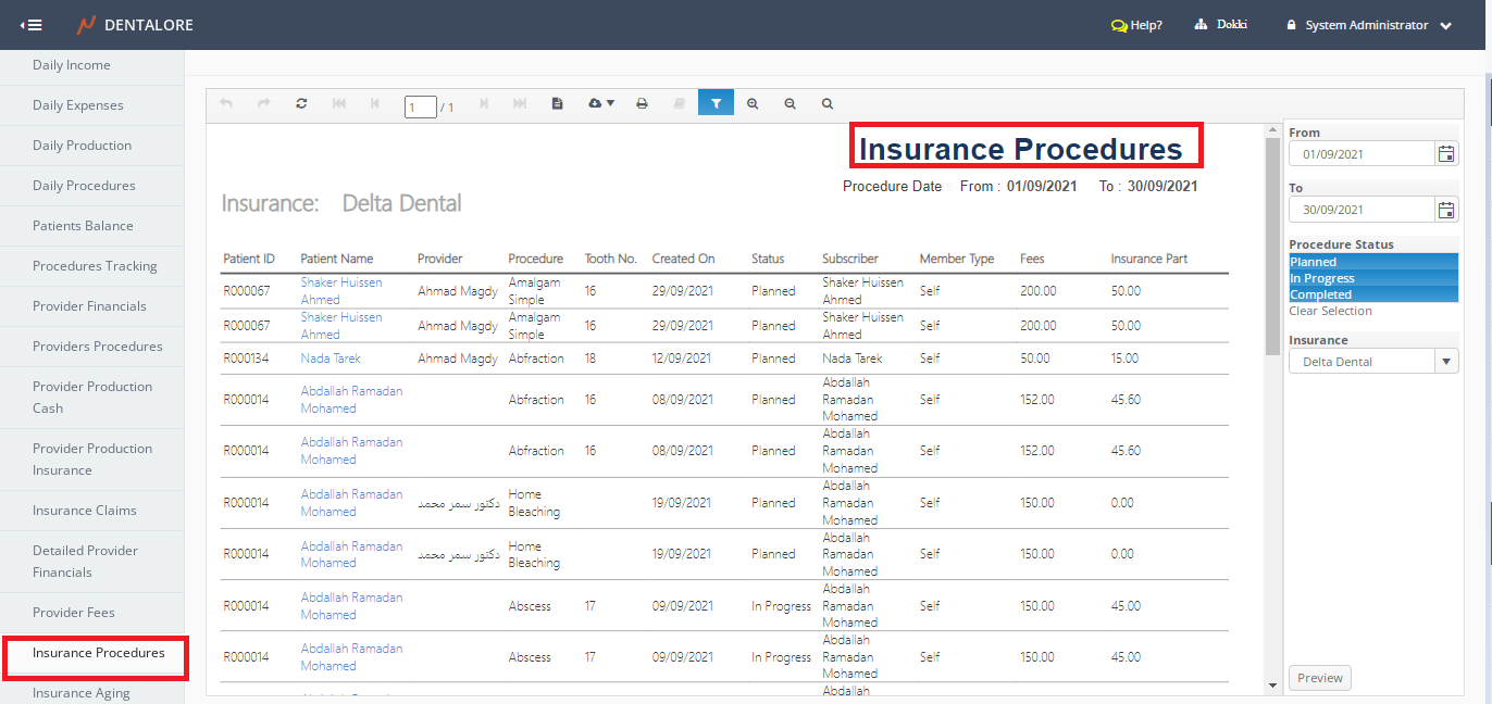 - Displays the procedures (of all status: Planned, In Progress, and completed) that have insurance part within the selected date range.