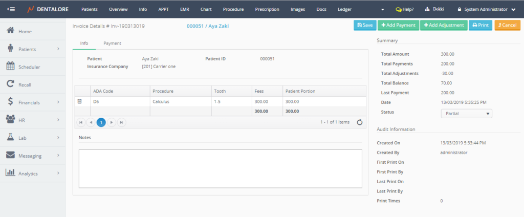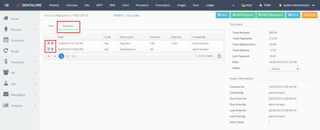 – Add Payment Against Invoice from Procedure Ledger. - “Add Adjustment” button: Once Pressed, User directed to new page “Add Adjustment” in order to add adjustment transaction against the invoice. For more information, Check: