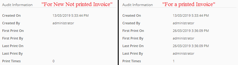 - First Printed By: displays the name of the user who sent the invoice for the first time.