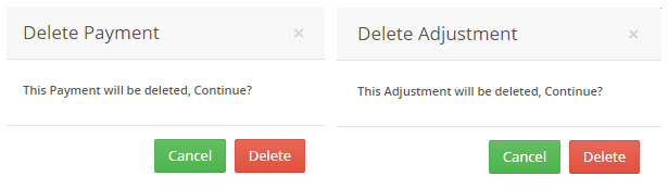 - “Delete”: Once pressed, a Popup “Delete Payment” opens to delete a payment transaction and a “Delete Adjustment” opens to delete an adjustment transaction.