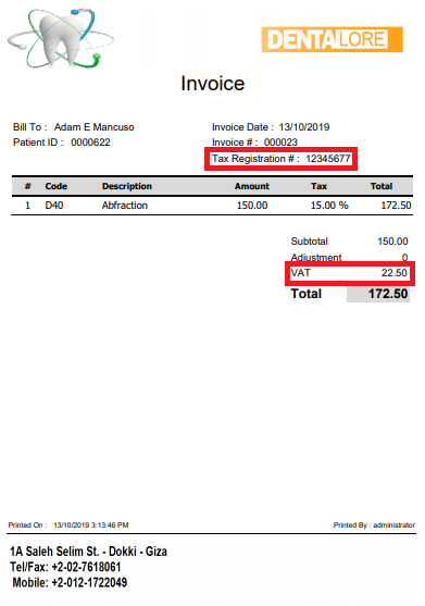 – Add Adjustment Against Invoice from Procedure Ledger. - “Print” button: Once Pressed, a drop down list is displayed with two options “Print with taxes” and “Print without taxes”