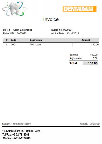 Invoice Details page is the view that displays the detailed info about the created invoice including the procedures, how many times did this invoice printed, audit info about it and many more info.