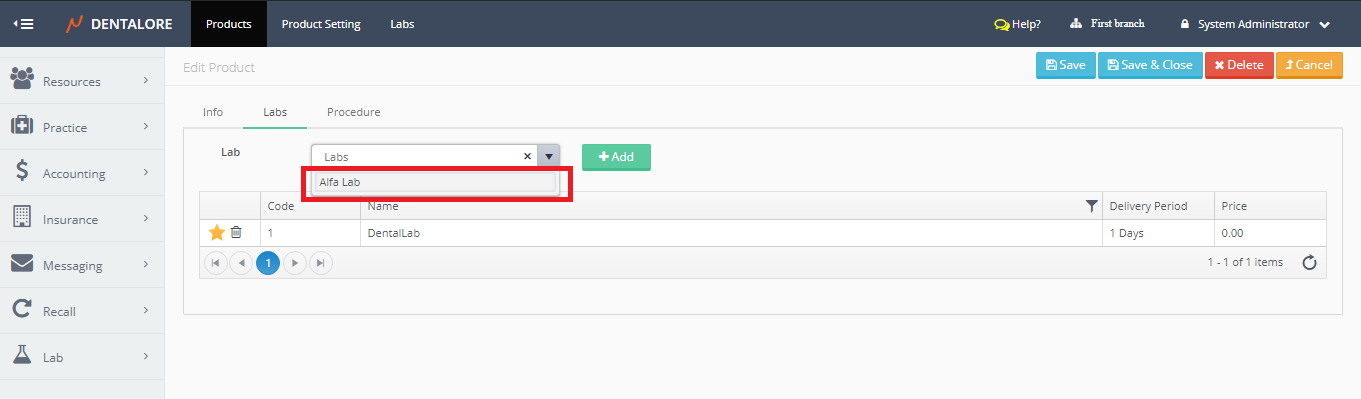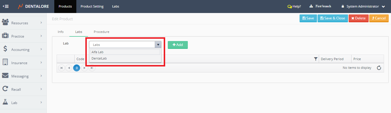 – (Labs) tab contains a drop down menu that includes all of the defined active labs in your clinic in order to select the required labs and assign selected product to them.