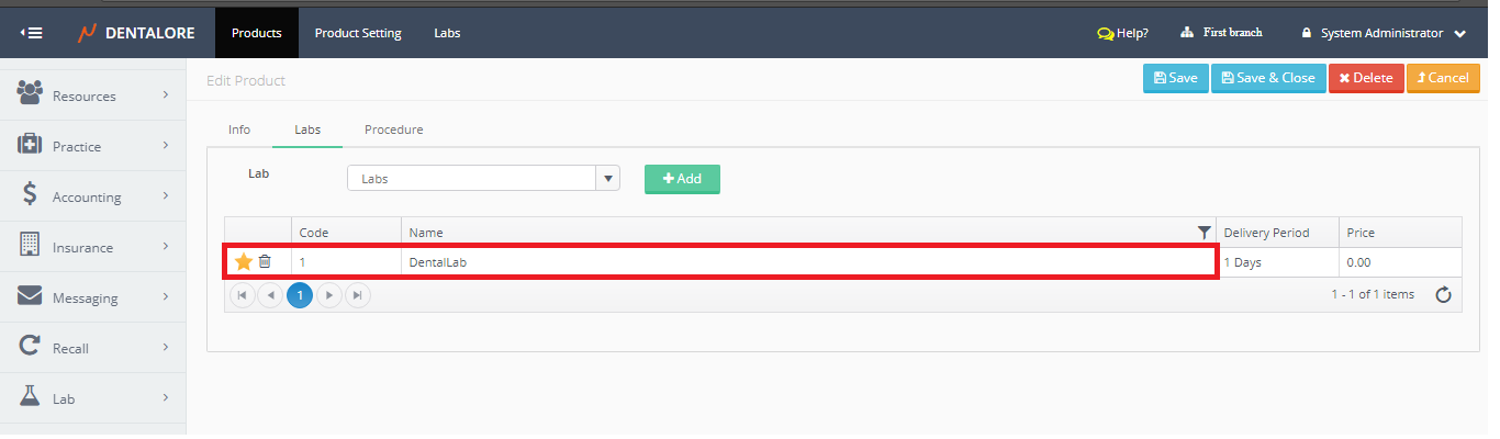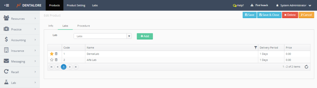 Note that the first added lab has a star beside it’s name colored in orange which means that this lab is selected to be the preferred lab for this product; that once this product is used, it’s preferred lab will be assigned to it by default.