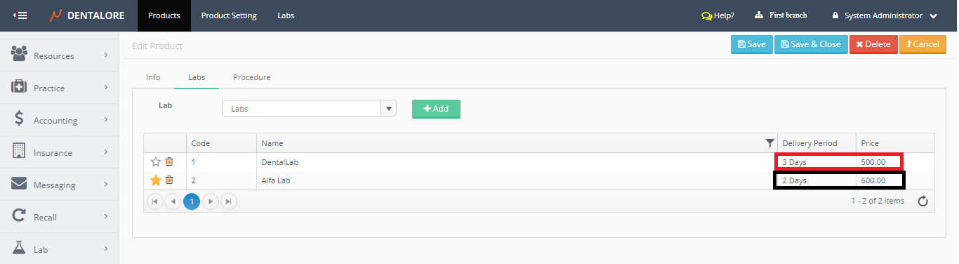 • Moreover, you have the ability to change both of the delivery period and price regarding each lab separately by double click it and update the data and then press Save.