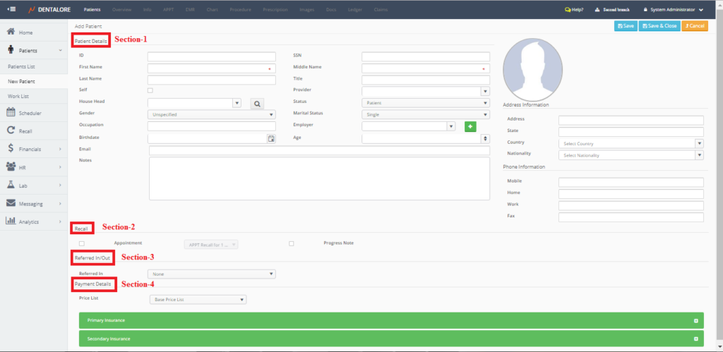 - First Name: Patient’s First Name, and this is a mandatory field to be able to save a new patient.