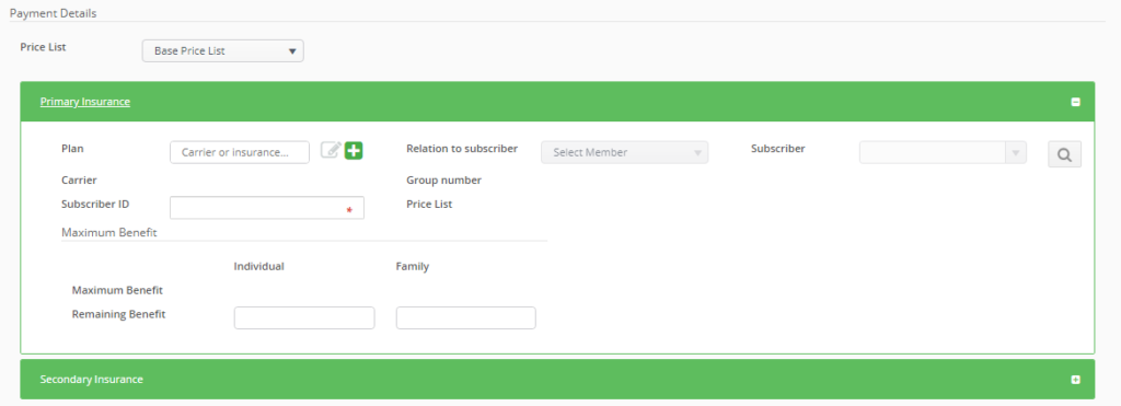 - Relation to Subscriber: Is a drop down menu to select the relation to subscriber, that could be the patient himself or one of his family (Child, Parent, Spouse, or any other member type defined from settings).