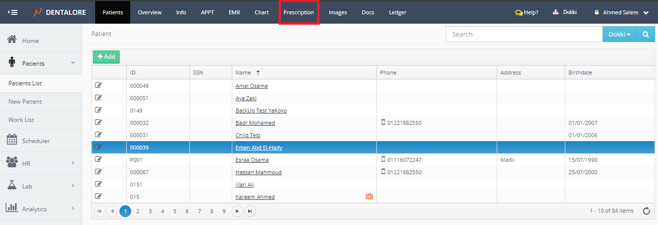 The main page of prescription lists and displays all of the prescriptions added for the selected patients.