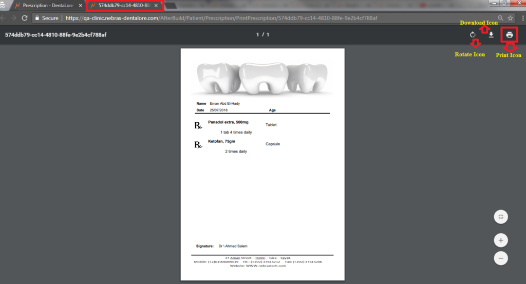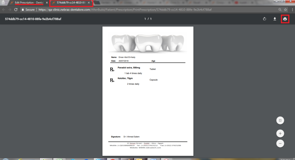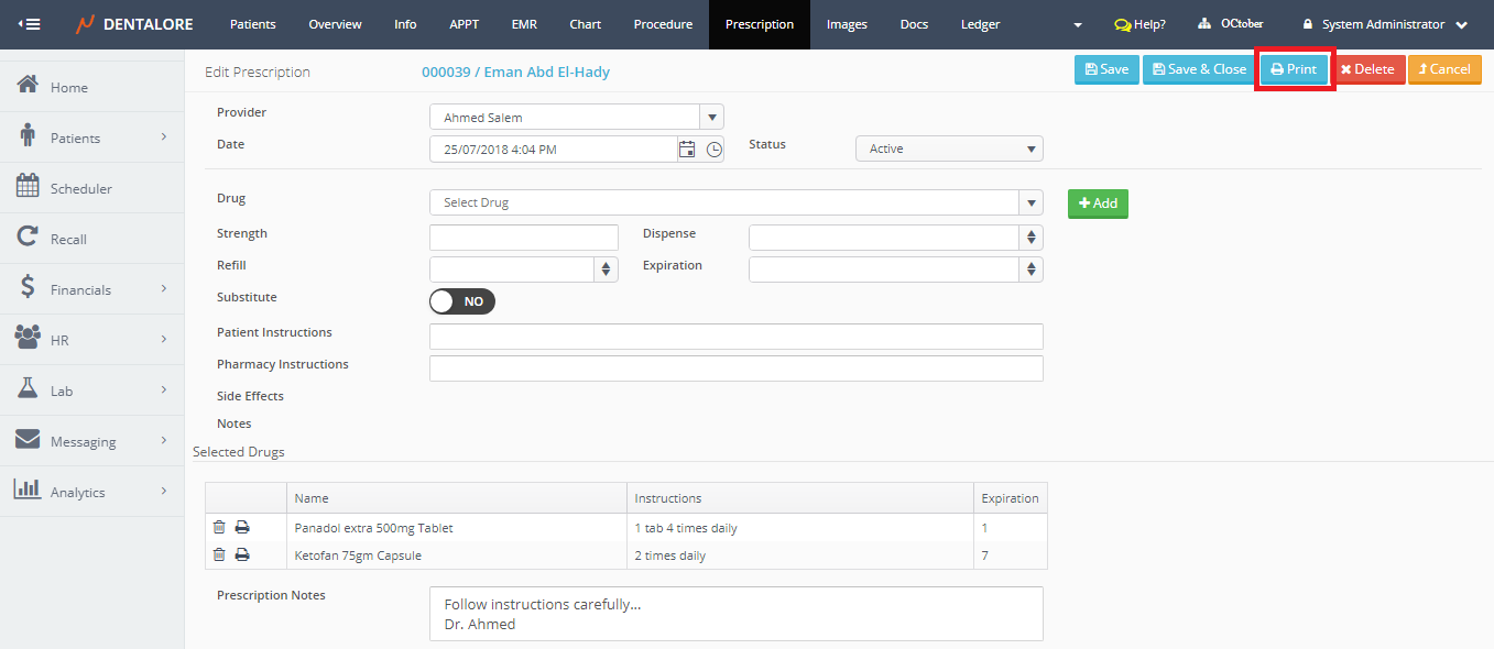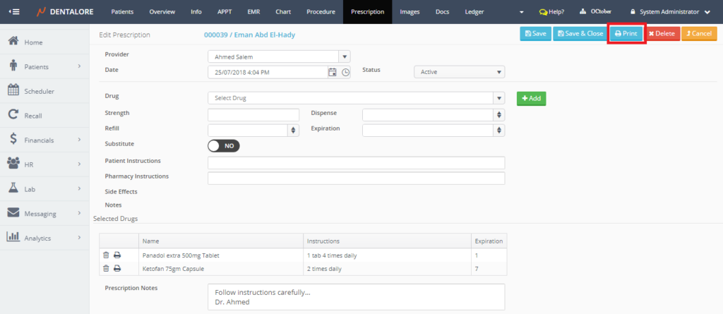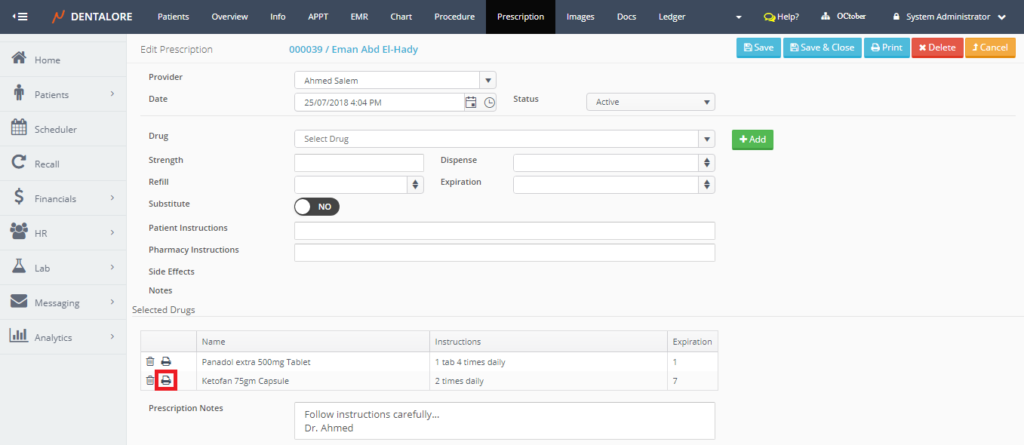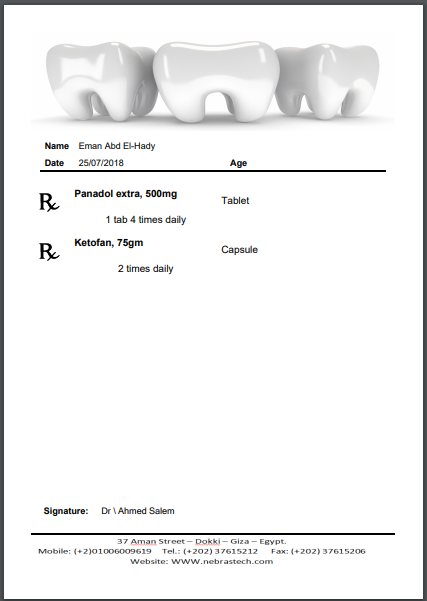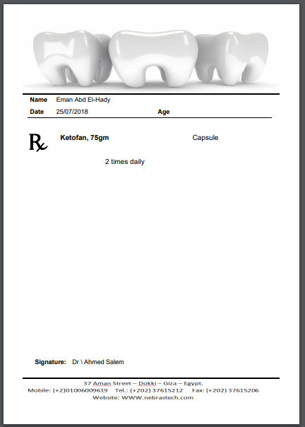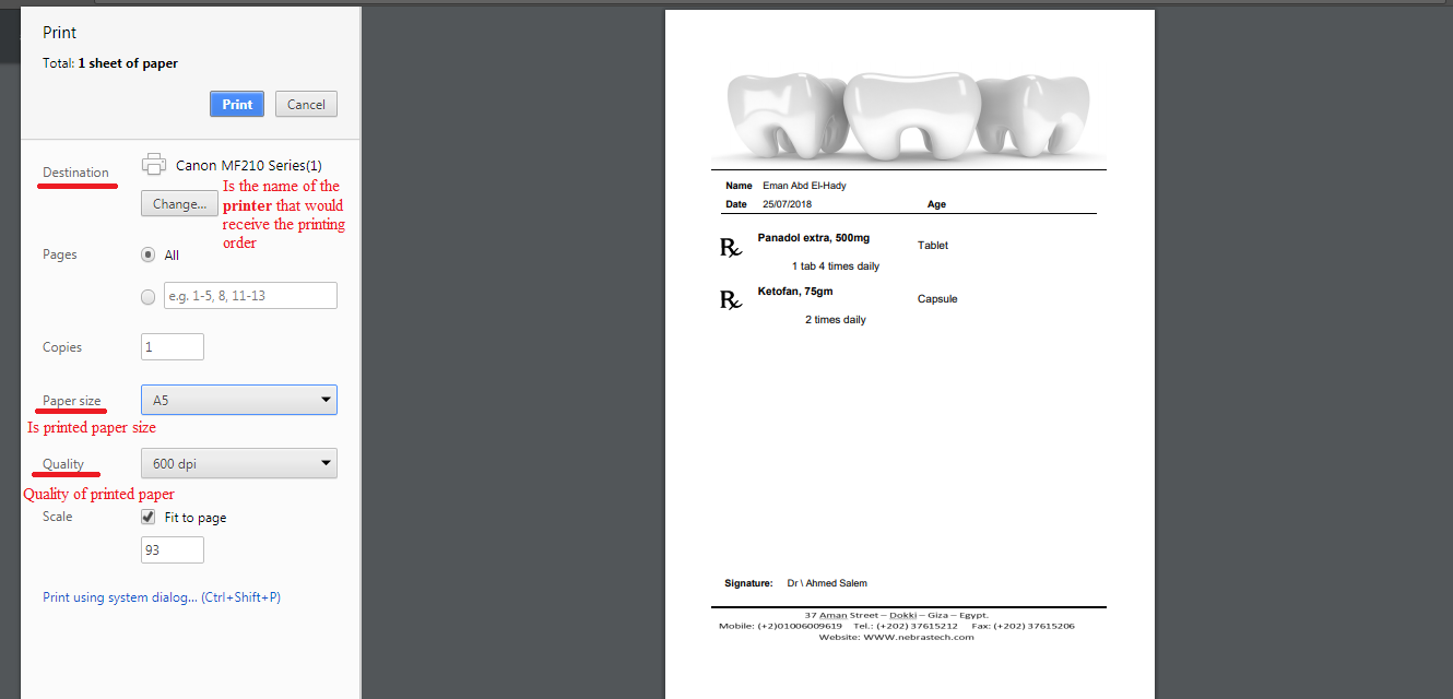 - Press “Print” button, and check settings from print popup then press “Print” button, as mentioned before. Prescription Printout looks like.