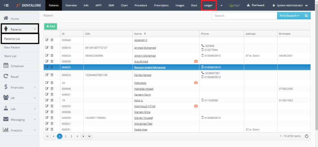 - Select any of the existing patients and then Select “Ledger”.