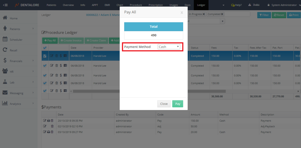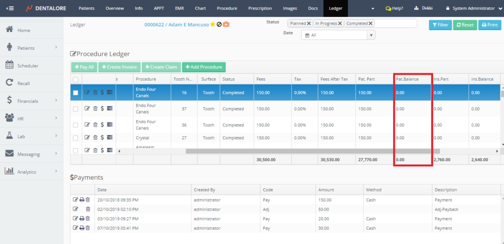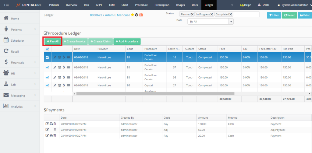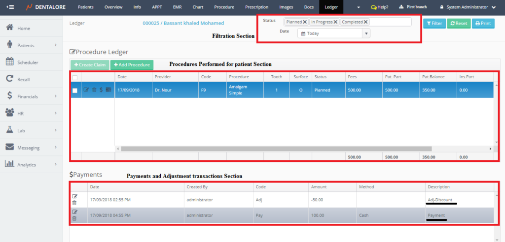Ledger is the place that manages all of the patients’ financials and displays the fees of procedures, paid amount, remained amount and any adjustments performed on the procedures of patient.