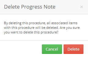 — “Delete” Icon: Once Pressed, popup “Delete Progress Note” appears to cancel or confirm the deletion of the selected procedure. For more information, Check: Delete Procedure