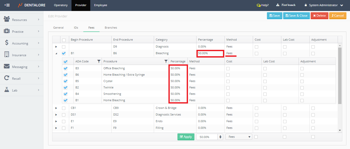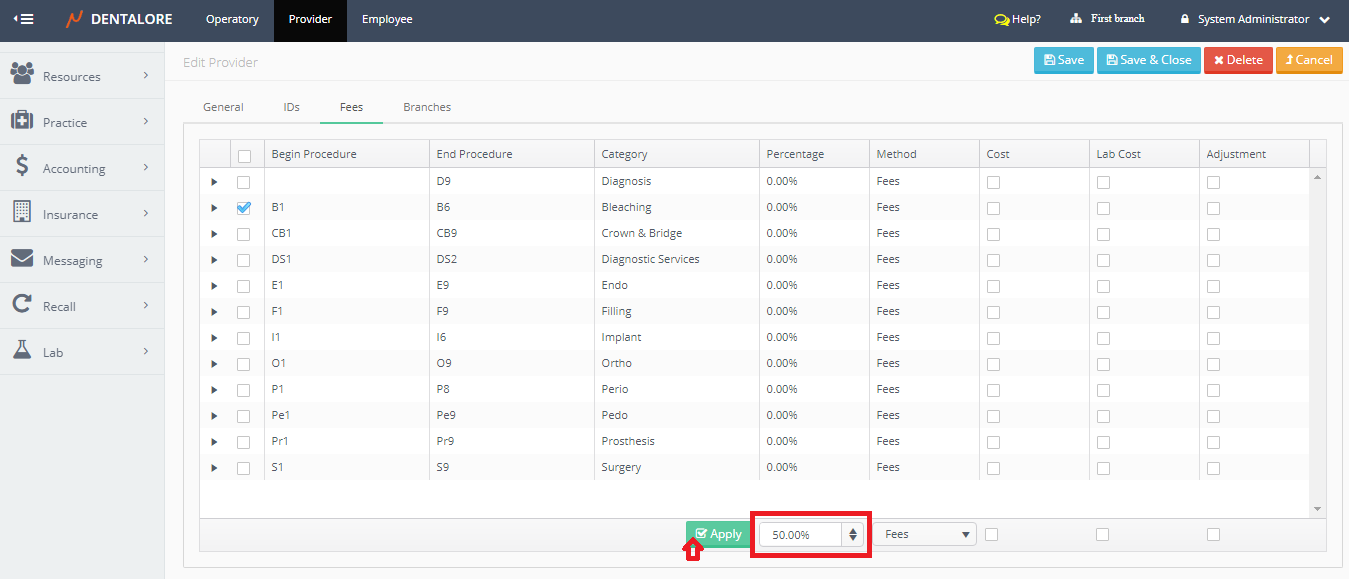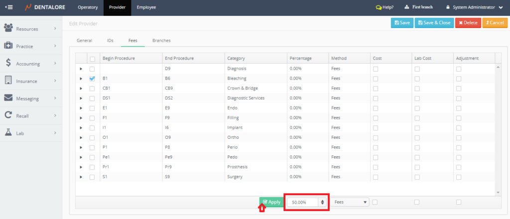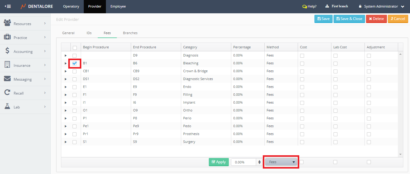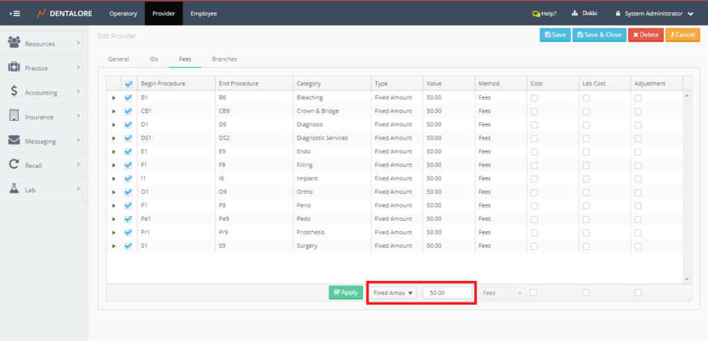 • Tick the Check box beside required procedures, and select method to be: (Fees) from the table's footer.