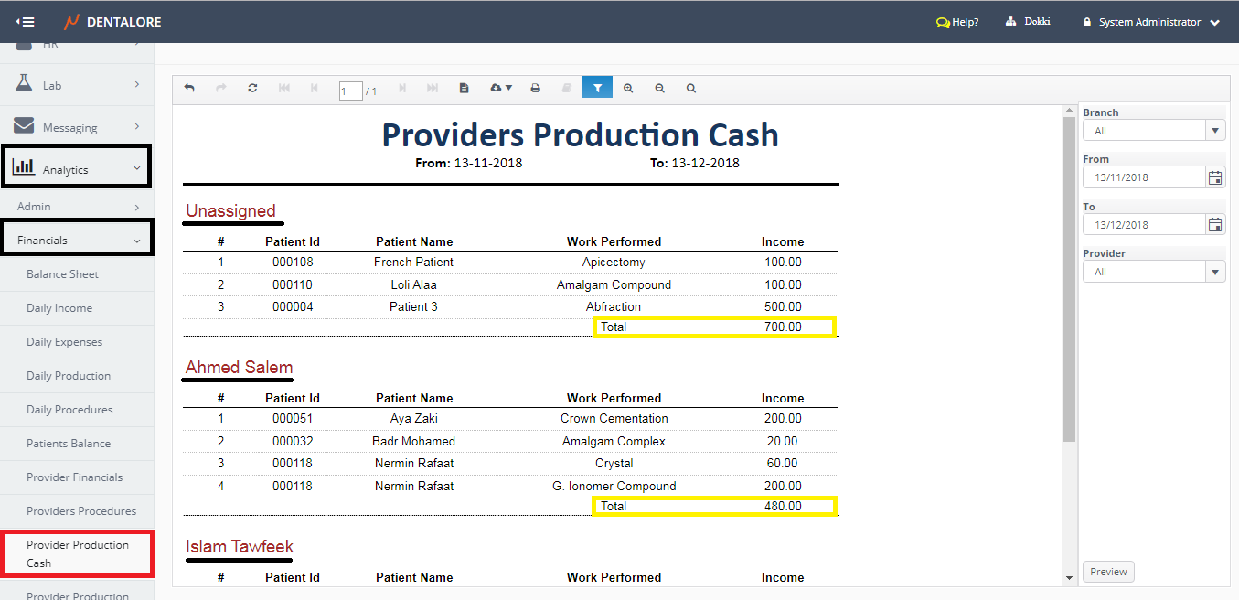 - Displays the name of each provider who makes income within the selected date range for the selected branch of clinic.