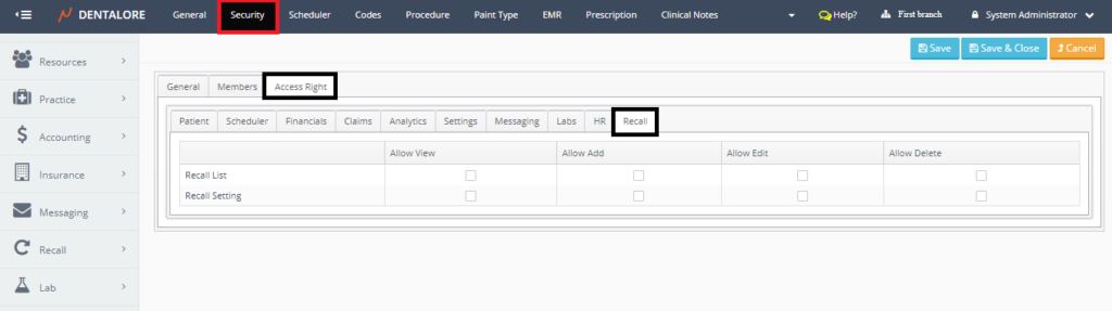 • Allow View: Displays the Recall Module Menu in DentaLore System.