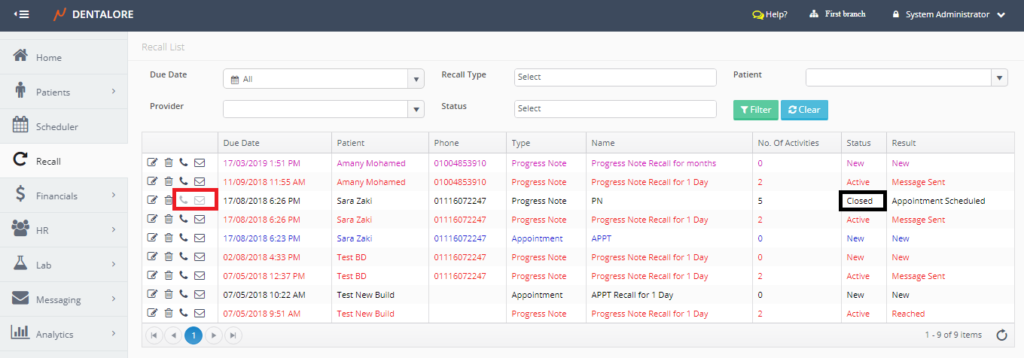 - No. of Activities: Column displays the count of activities performed on the recall record, that means any action performed on the patient's recall increase the count of activities. Theses actions are: