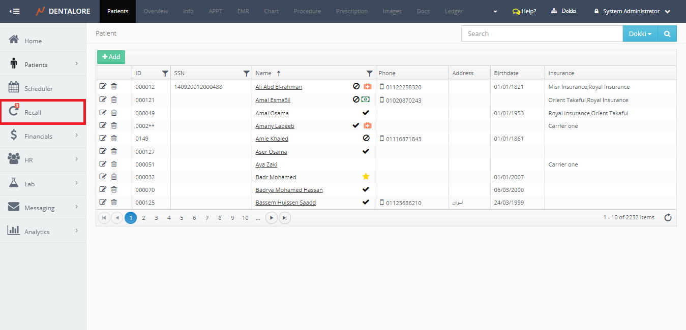 Recall is one of the advanced and most useful modules in Dentalore Cloud system in which the main purpose of Recall module is to help the user to track and recall his patients in clinic upon specific period of time, visits, and procedures that all could be managed from the Settings module.
