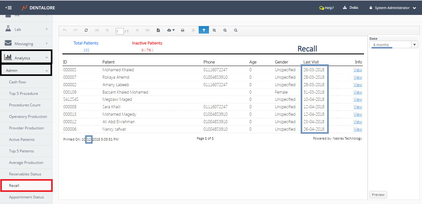 -> N.B.: The total count of inactive patients is the count of patients displayed in the report. And the Percentage is calculated based on the total count of all patients exist in the clinic.