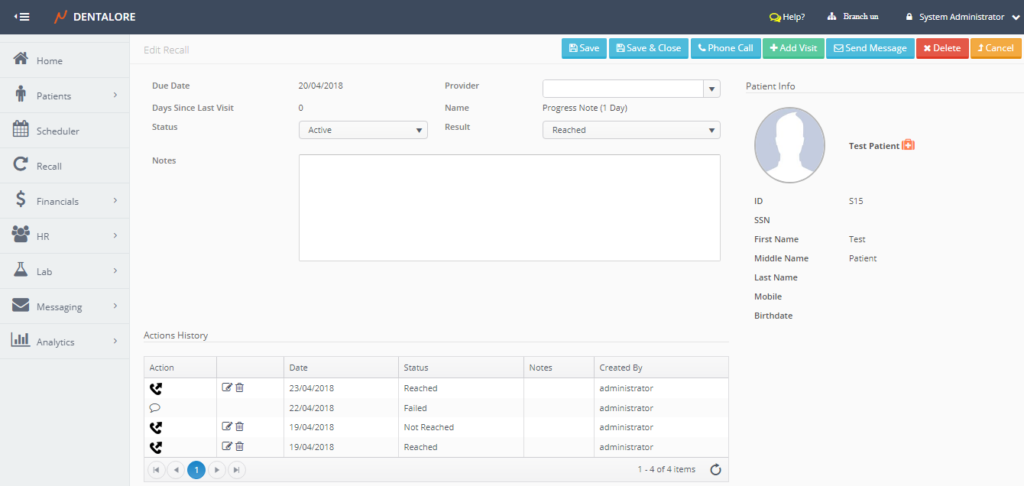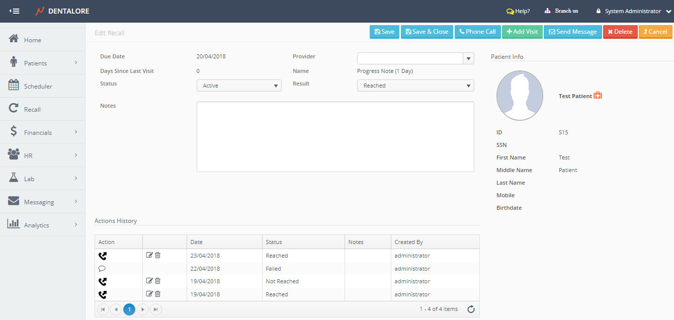 – Add visit - Once the recall created, it’s added with status (New) and Result (New). After performing any of the mentioned actions (Phone Call or Send Message); its status automatically changed to be (Active) with Result of performed action. And if the (Add Visit) action done, then the status becomes (Closed) with Result (Appointment scheduled).