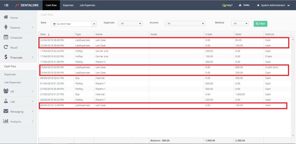 In the “Cash flow” page, the lab expenses records are displayed similarly as the expenses displayed, and user could filter by the “Lab Expenses” item in the (Expenses) drop down menu to display only records of lab expenses.