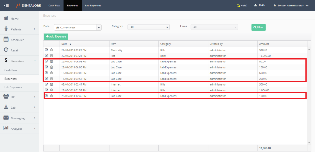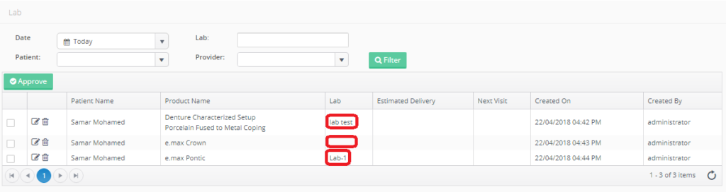 In the “Expenses” page, the lab expenses records are displayed similarly as all other expenses records, under new category called (Lab Expenses) that’s automatically relate the lab cases to it. And user could filter by the “Lab Expenses” item in the (Expenses) drop down menu to display only records of lab expenses.