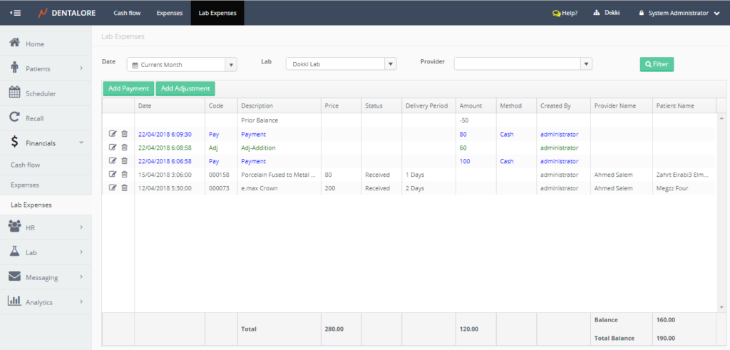 - In the lab Expenses view, you could perform payment or adjustment for a selected lab. The payment record listed in blue color and the adjustment (Addition or Discount) listed in green color. As well you could directly know the balance of this lab within the selected date range and the total balance for this lab once you start dealing with it till today (Total Balance display all balance regardless the date selection criteria).