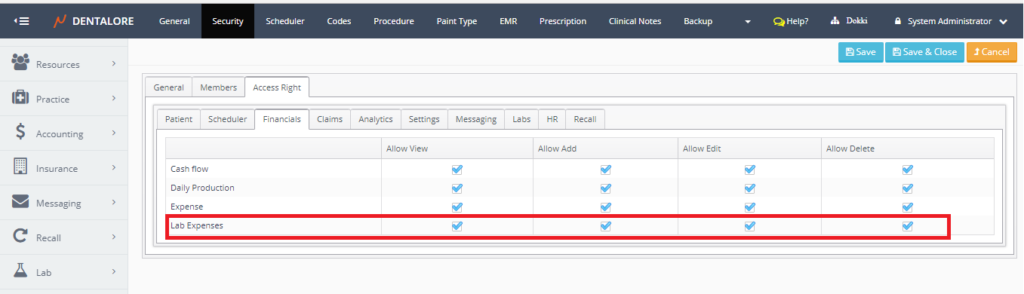 - Allow view: Give the user ability to view Lab Expenses module.