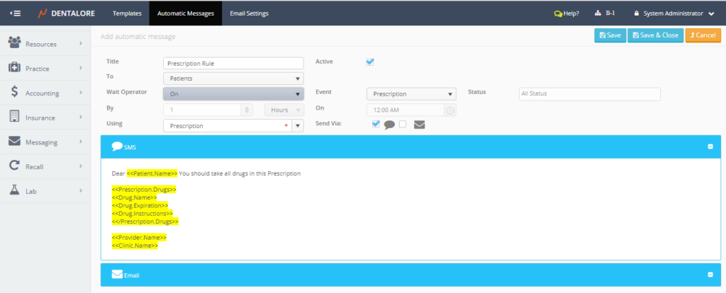 User could create automatic rule using the “Prescription” event and required template to automatically send SMS/Emails to patients.