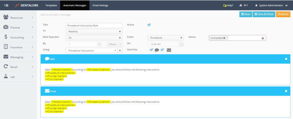 Automatic Message (SMS/Email) sent with Procedure Instructions