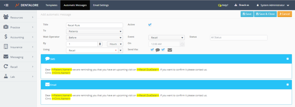 Recall automatic SMS/Email could be sent to patients once any of the recall conditions is achieved & the recall created.