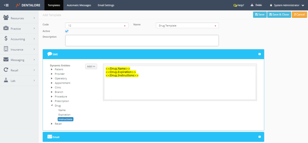 Go to Settings –> Messaging –> Templates –> Add –> Use dynamic entity “Drugs”.