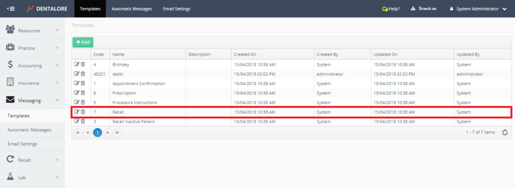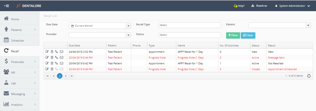 Recall is a new module listed in the main Dentalore vertical menu that enables the user to track patients’ recalls & follow up with them over an interval of time depending on many conditions.