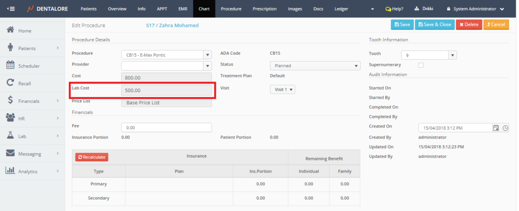 - User could edit the price of the lab product directly from this view (Lab Expense) & this edit will not affect the original price set from settings. Edited price will only be reflected in the “Lab Cost” field in the “Edit Procedure” page.