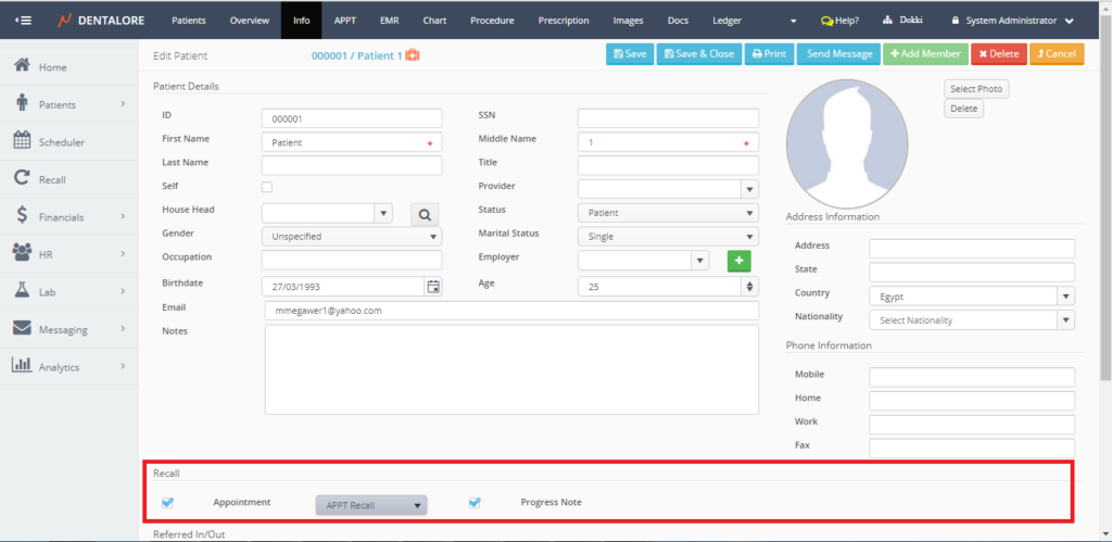 From the “Info” patient’s module, you must tick the check boxes for the (Appointment) and/or the (Progress note) in which this controls what type of recall will be created for this patient.